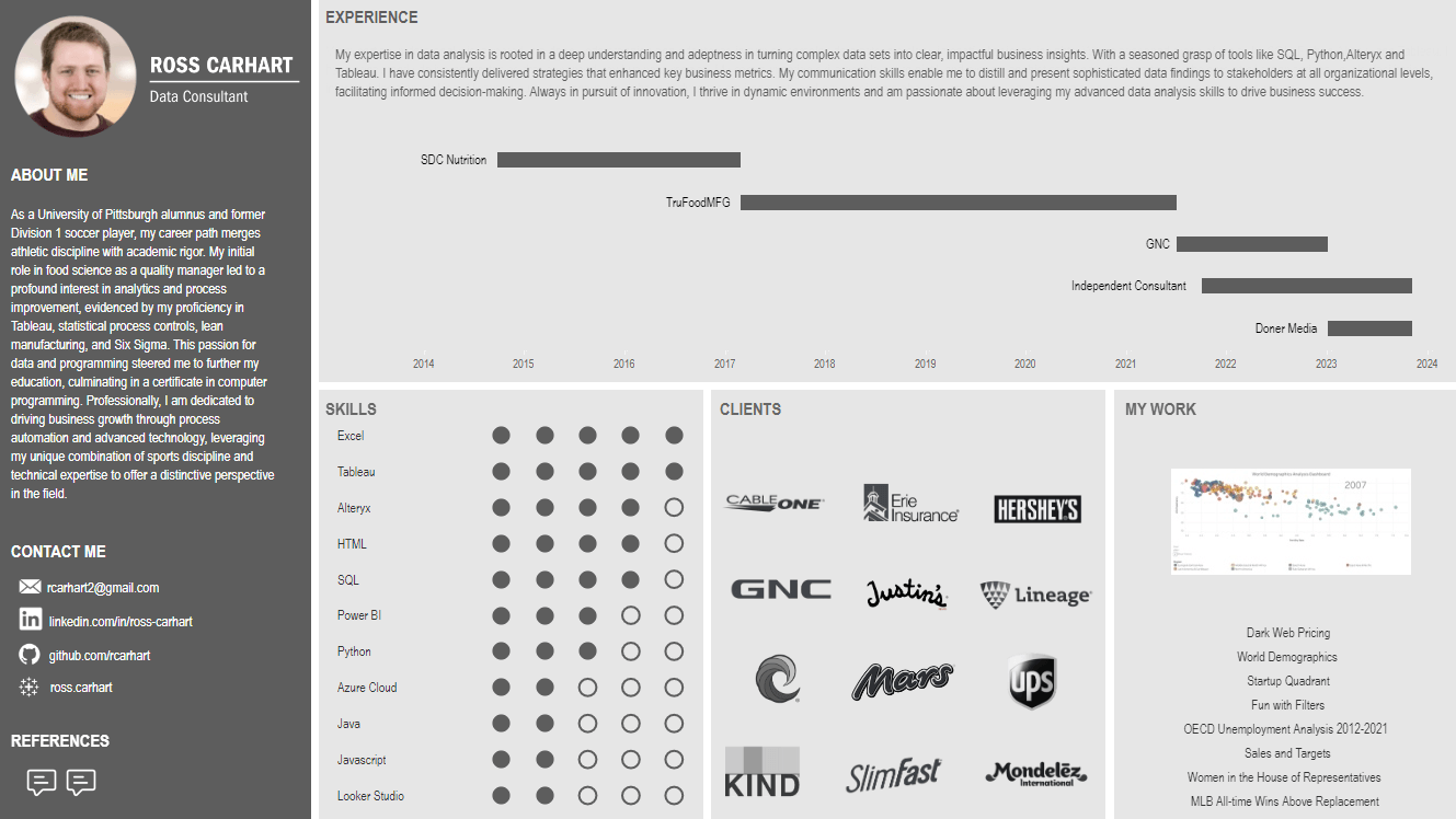 Hi, I am Ross Carhart. I am a dedicated data professional and consultant with a passion for leveraging data to solve complex business problems and drive measurable growth. Over my career, I've specialized in transforming messy, complex data into clear, powerful business insights that directly impact the bottom line. I thrive on collaborating with cross-functional teams to build robust, scalable data solutions. My work has involved partnering with major brands to uncover actionable marketing insights and automate reporting processes, resulting in millions of dollars in savings and increased efficiency. My expertise lies in modern data warehousing technologies, including Snowflake and Databricks. I focus on creating efficient data models and automating workflows, ensuring businesses have reliable, high-quality data when they need it. I believe data should be an accelerator for business growth, not a bottleneck. Explore my projects below to see my methodologies in action, or feel free to connect with me to discuss how we can unlock your data's full potential.